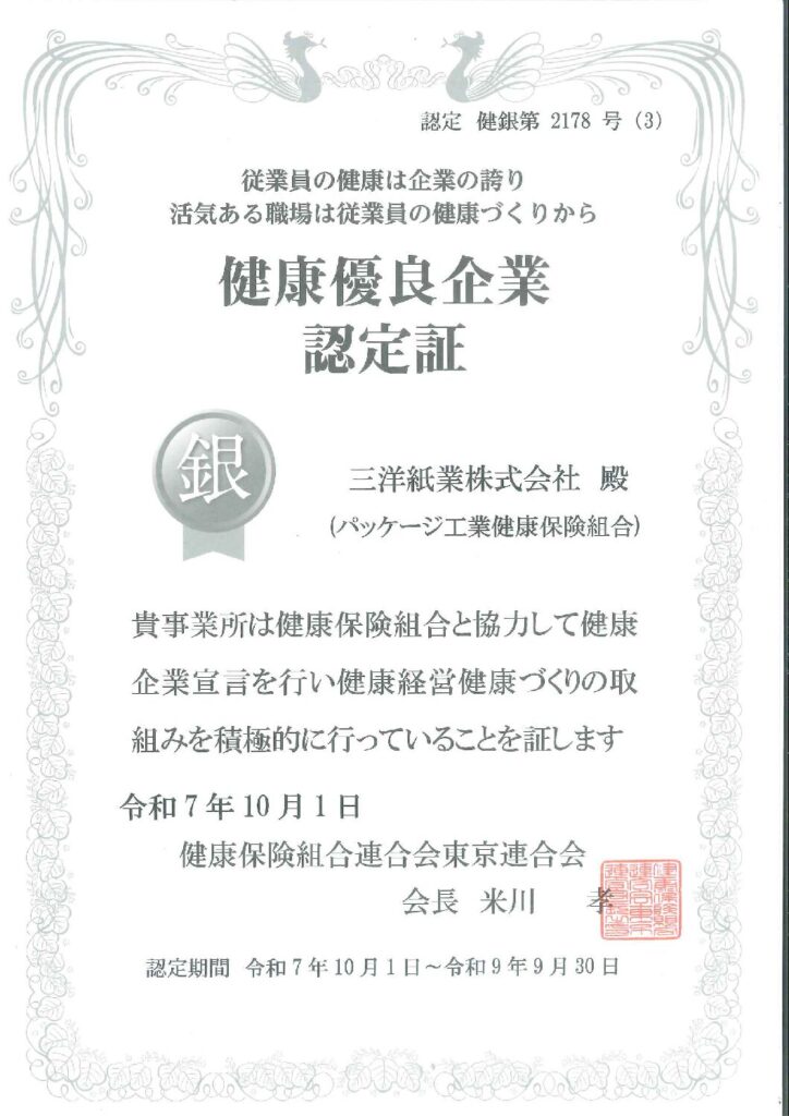 令和7年10月1日付で健康優良企業「銀の認定」に更新認定されました。(健康優良企業認定番号 健銀第2178号(3))