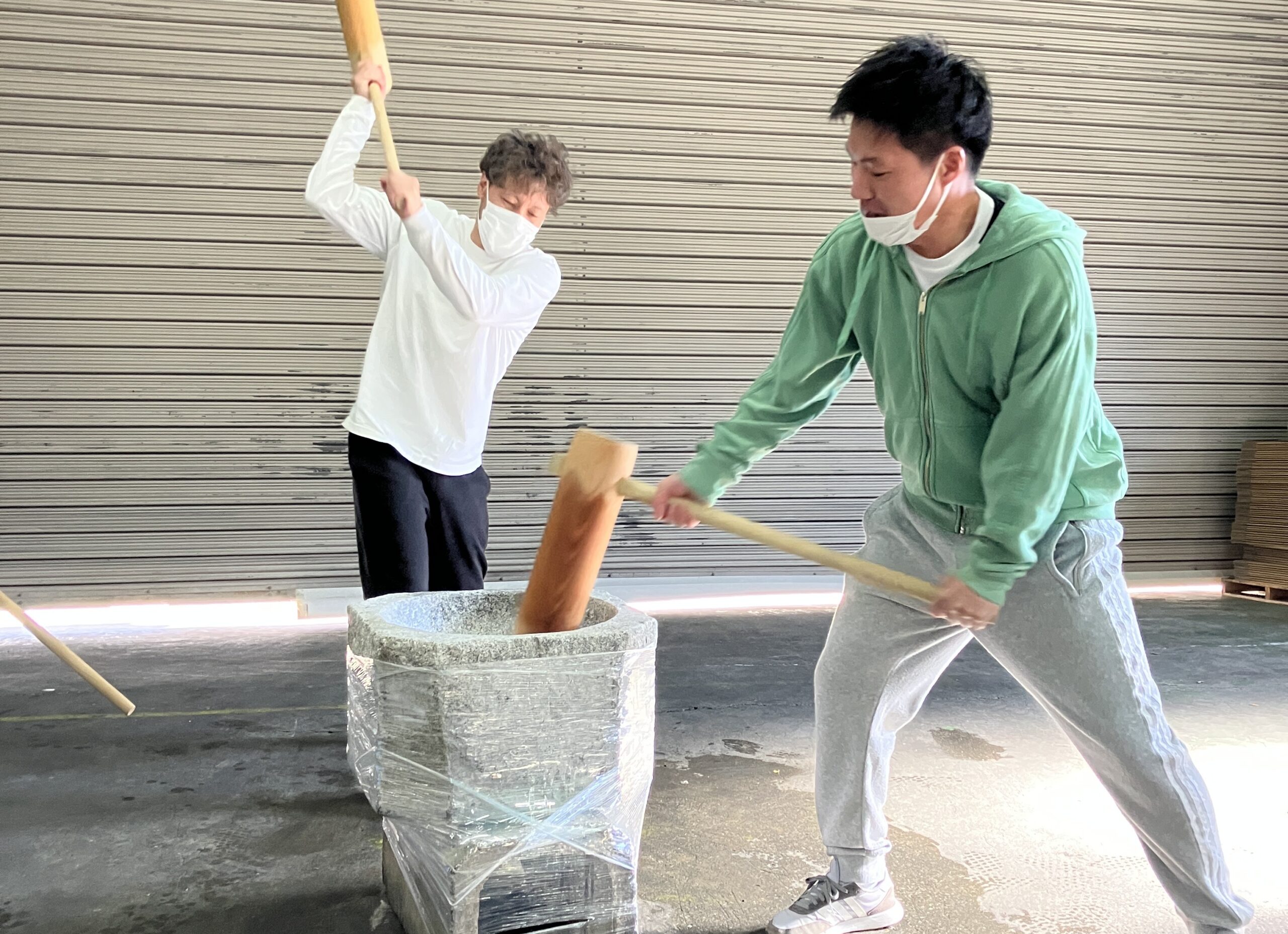 大掃除の後には石臼を使って本格的な餅つきをします。全員が順番に餅をつき、全員でついたお餅を頬張ると格別のおいしさです。自分でついたお餅ってこんなに美味しいんですね。